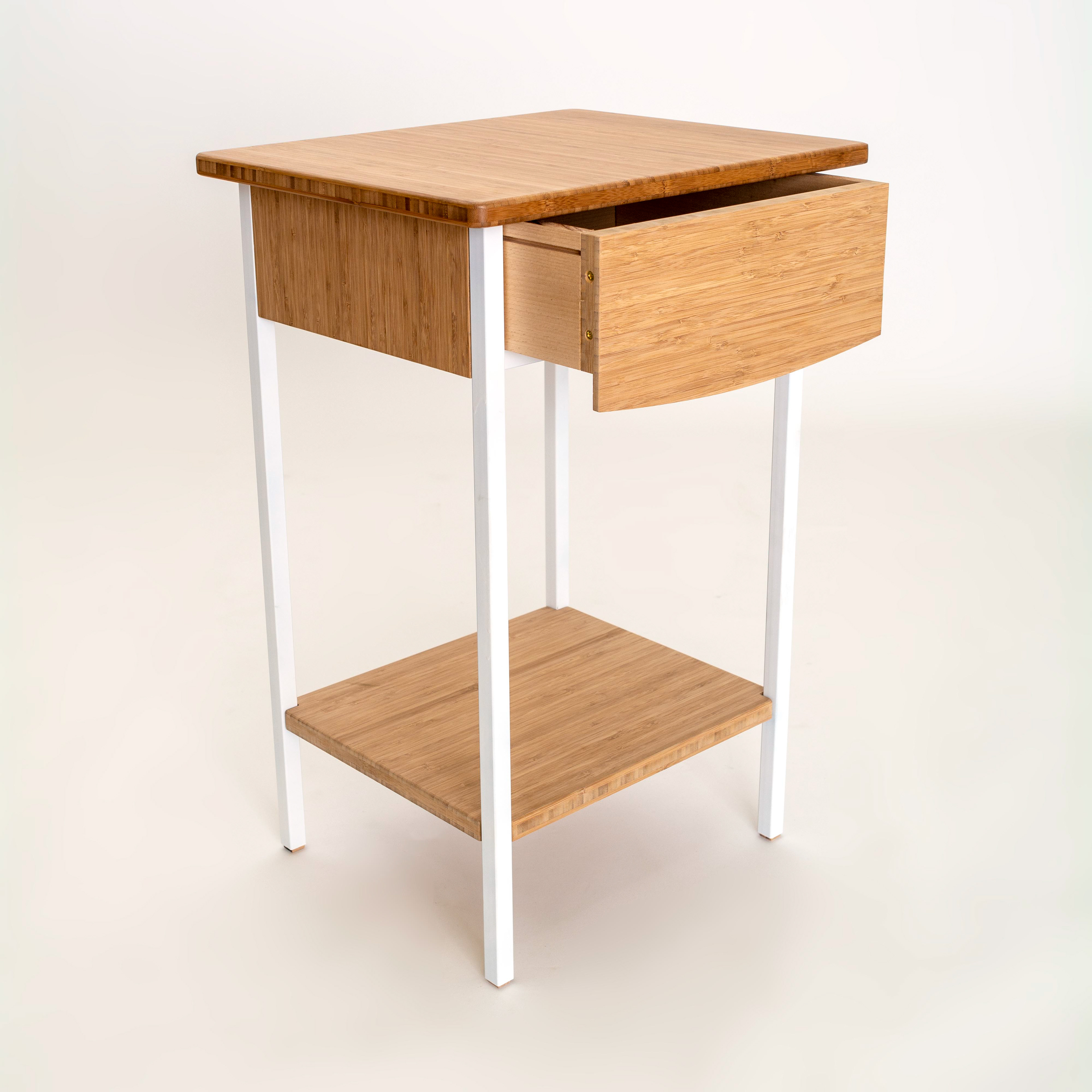 This is a line of nightstands that I designed and have made about a dozen of. A lot of people really love it. Natural wood surfaces and metal frame. Wood speciesĀ and colors are made to order.